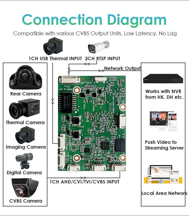 - Video Input Interfaces3PIN PH1.25 AHD/CVI/TVI/CVBS Input | Network Stream Input | 4PIN PH1.25 USB2.0 Input