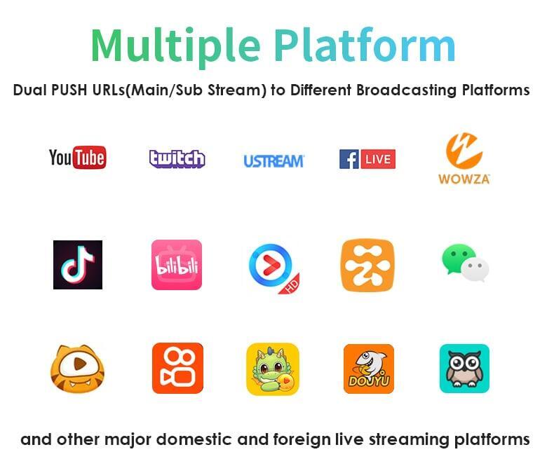 Multi-Platform Broadcasting: Pushes RTMP (H.264) to YouTube, Facebook, Twitch, Wowza, vMix, Wirecast.